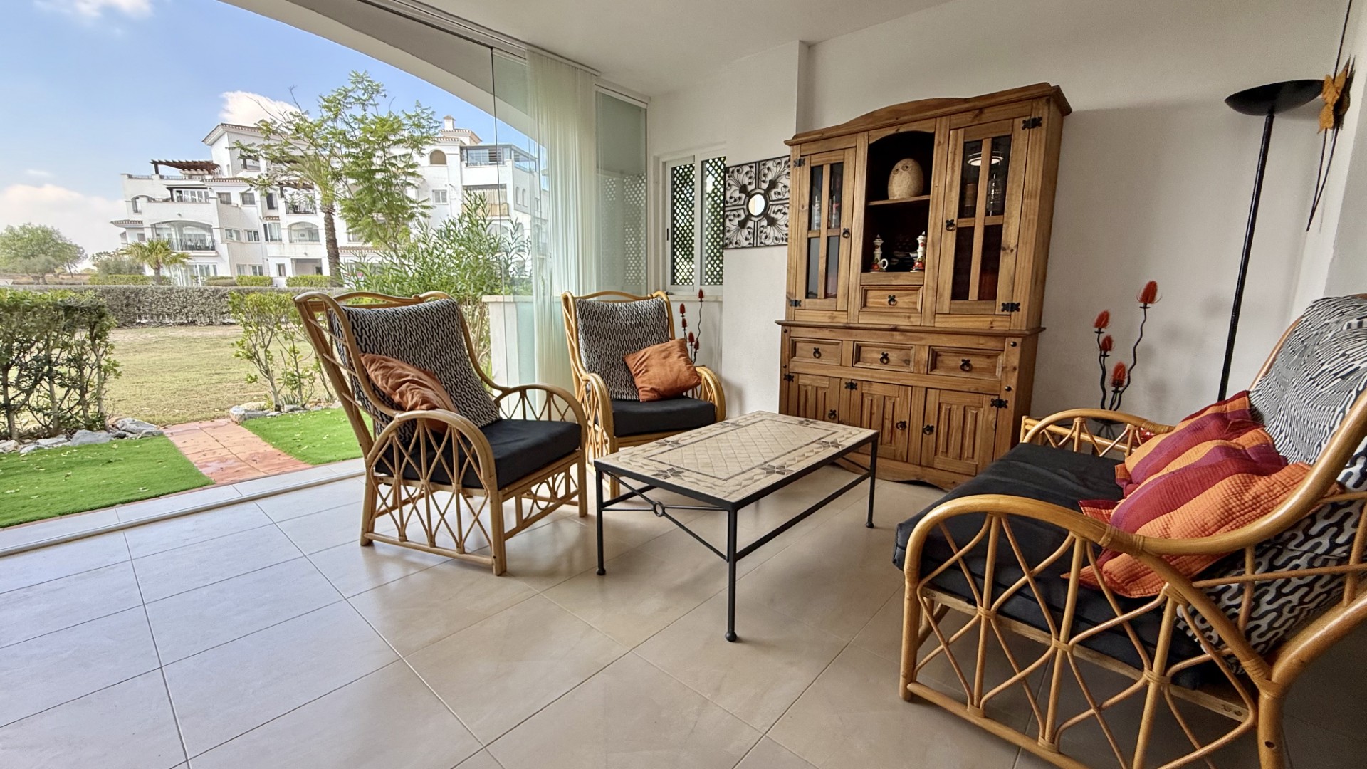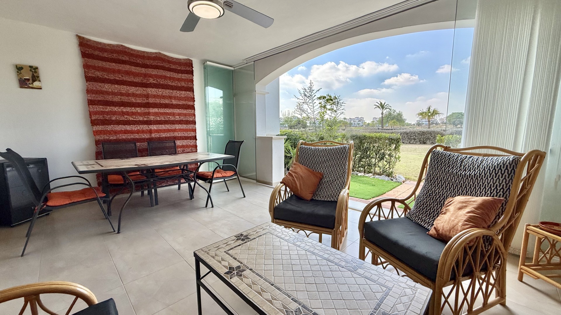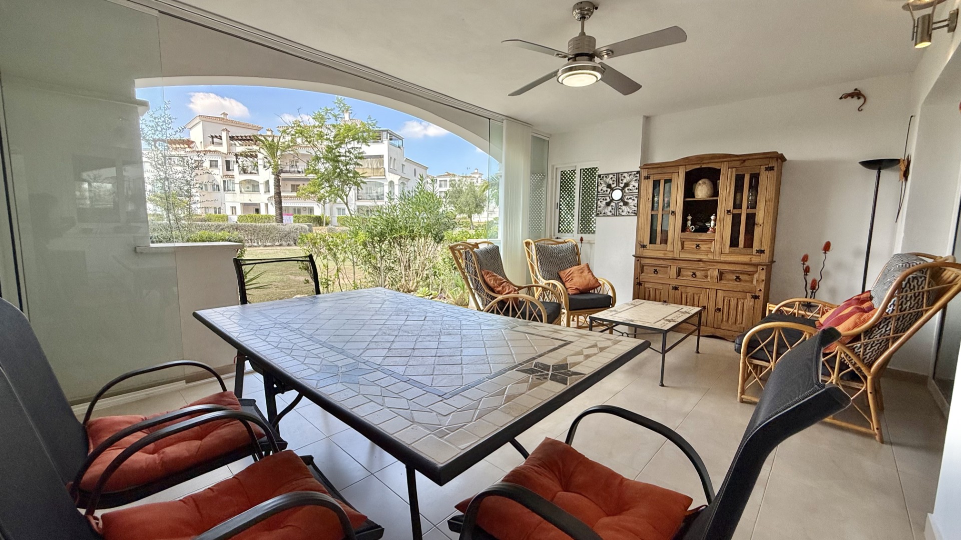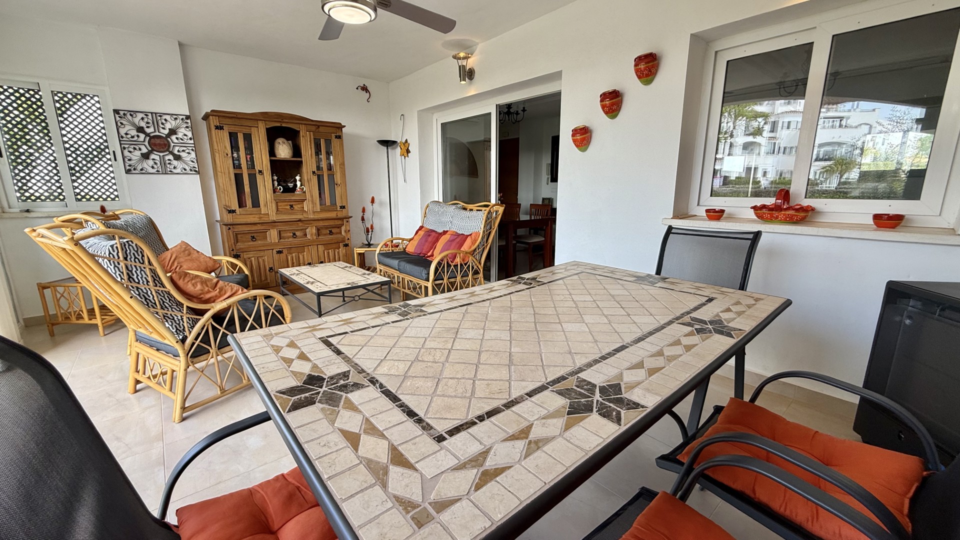 Set on the ground floor, the apartment opens onto a superb re-tiled terrace enclosed with full glass curtains, creating a seamless extension of the living space. Perfectly positioned for year-round enjoyment, the terrace offers a wonderful place to relax, dine or entertain while overlooking the peaceful garden surroundings and pool.