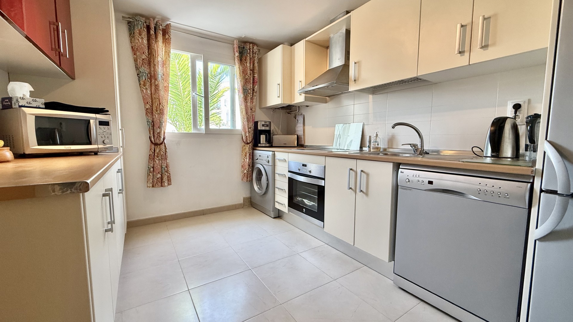 Inside, the spacious living area is filled with natural light, flowing effortlessly through to the terrace. The kitchen is bright and well equipped, with a large window framing the palm trees outside.