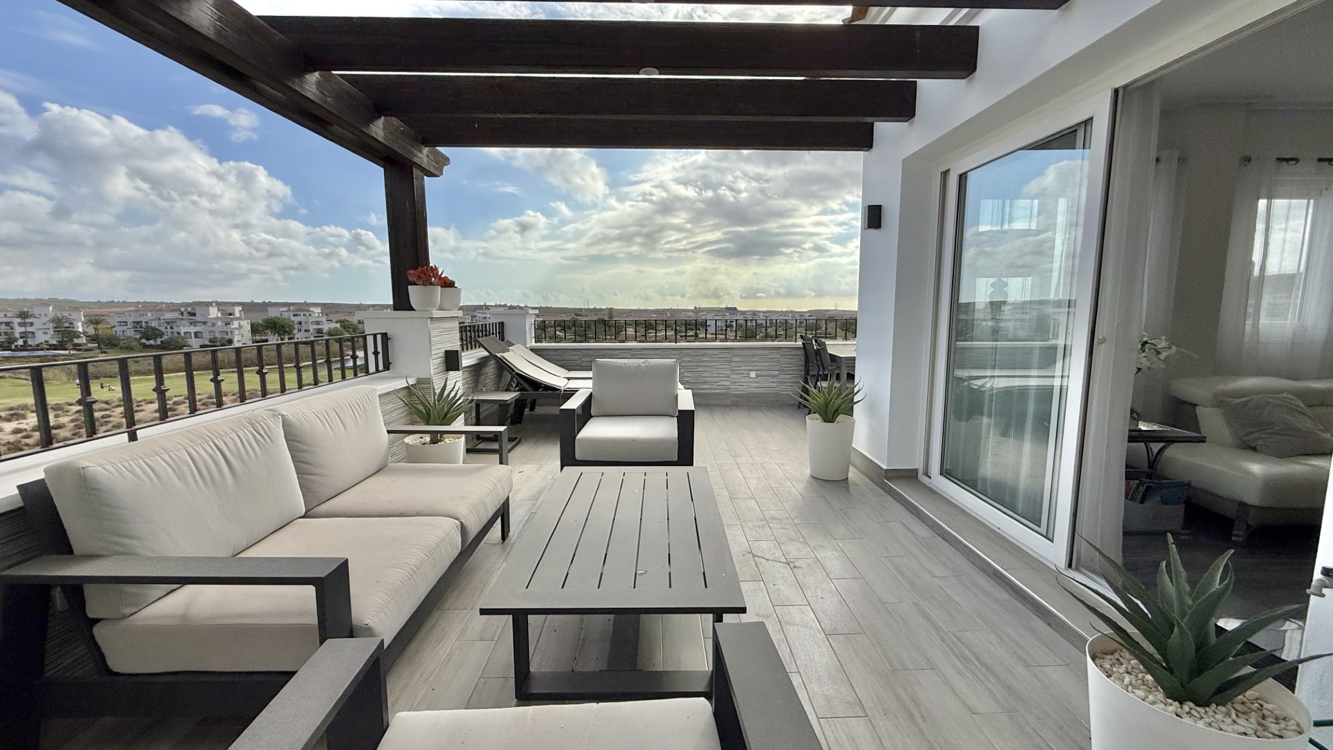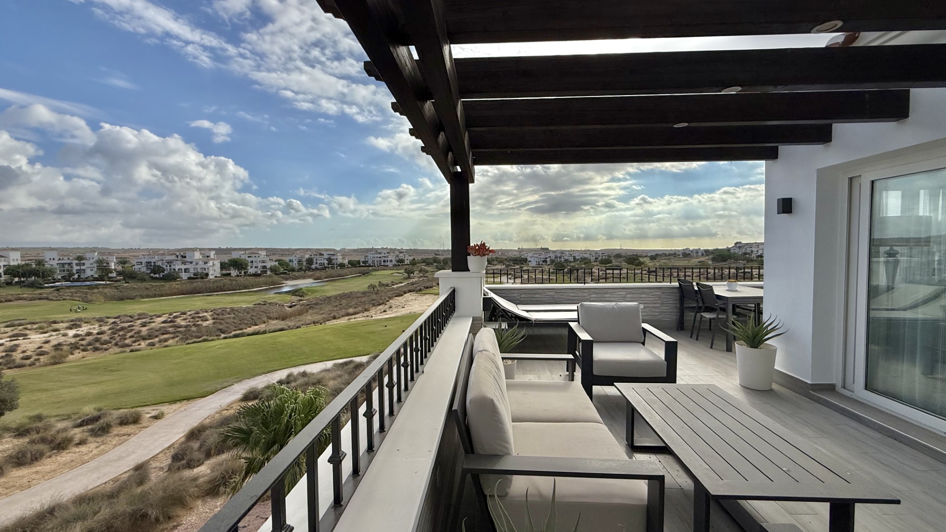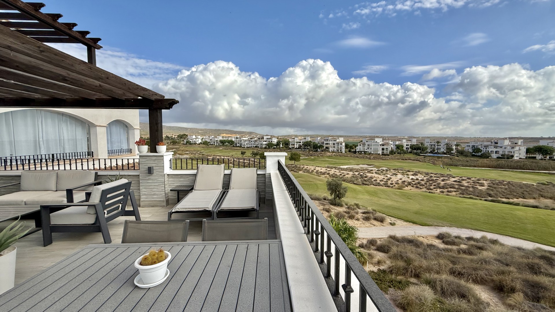 The interiors are modern and refined, with a superb open-plan living space that flows seamlessly onto the expansive terrace. From here, the outlook is nothing short of remarkable – a wide, open vista that captures both the greenery of the fairways and the endless blue of the sky.