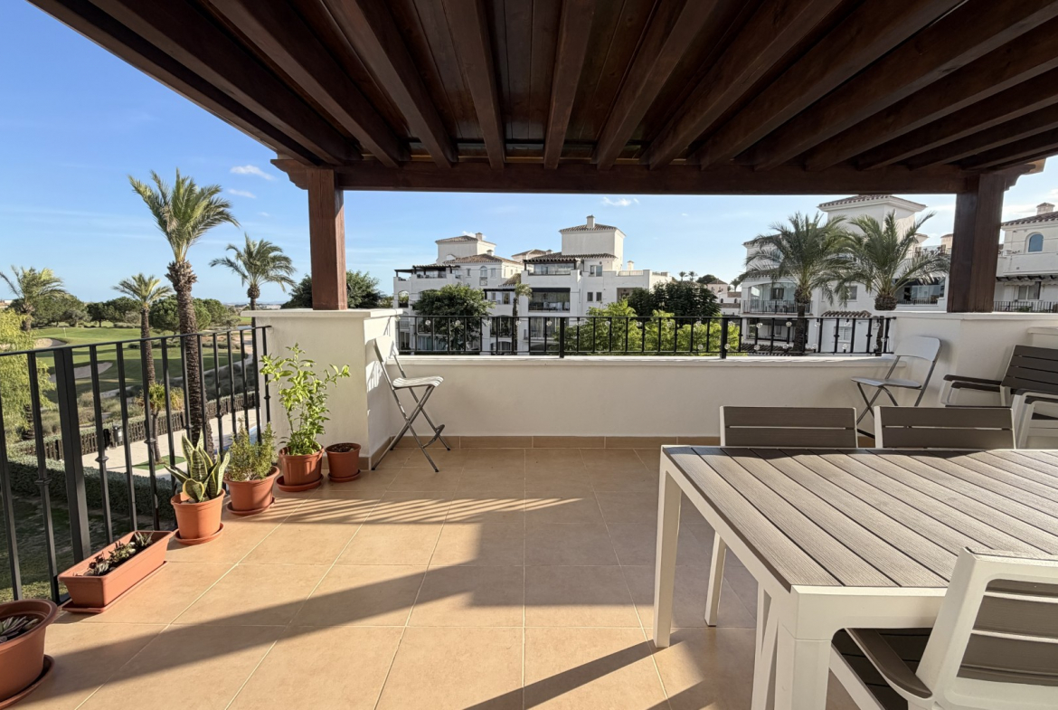 Beautifully positioned in a quiet no through road on Hacienda Riquelme Golf Resort, this south-facing end apartment offers sunshine, privacy, and views that are simply exceptional – looking directly across the swimming pool, palm trees, and manicured fairways of the golf course.