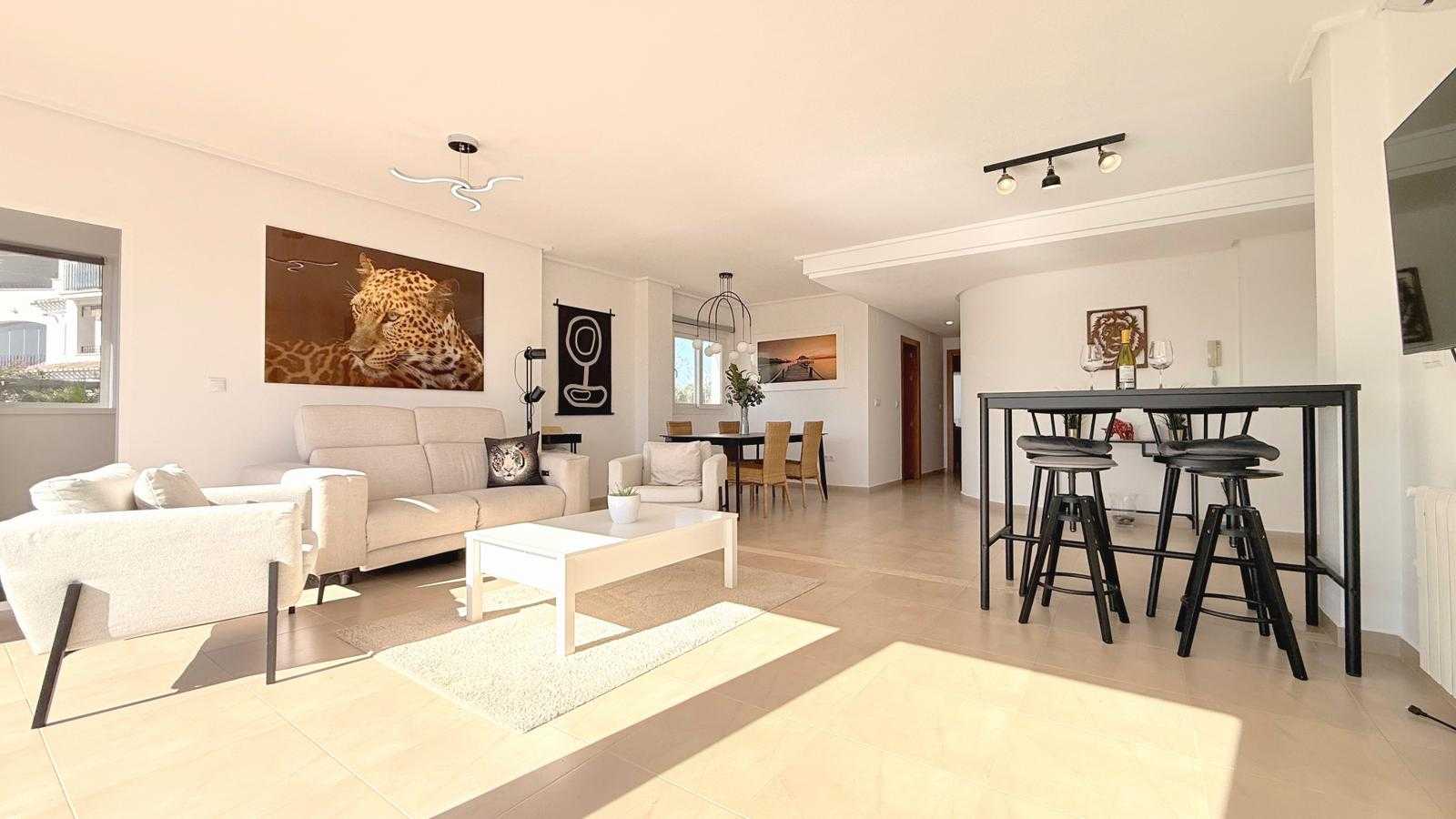 One of the finest examples of a poolside end curved wall apartment to come to market on Hacienda Riquelme Golf Resort, this immaculate two bedroom property has been extensively upgraded and beautifully presented to create a striking modern open-plan living space of exceptional width and light.