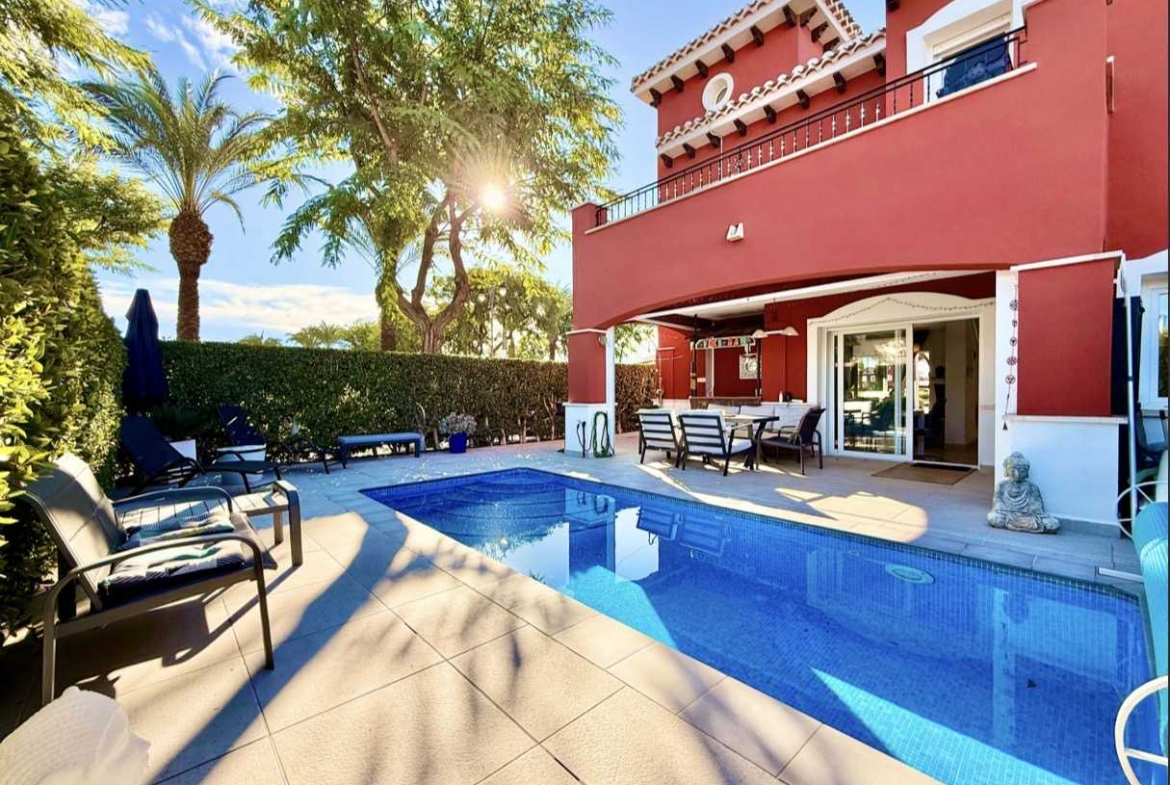 Located in a prime end position on the prestigious Mar Menor Golf Resort, this beautifully presented two-bedroom, two-bathroom Isla Grosa villa offers a rare combination of privacy, space, and one of the most attractive outdoor settings of its type.
